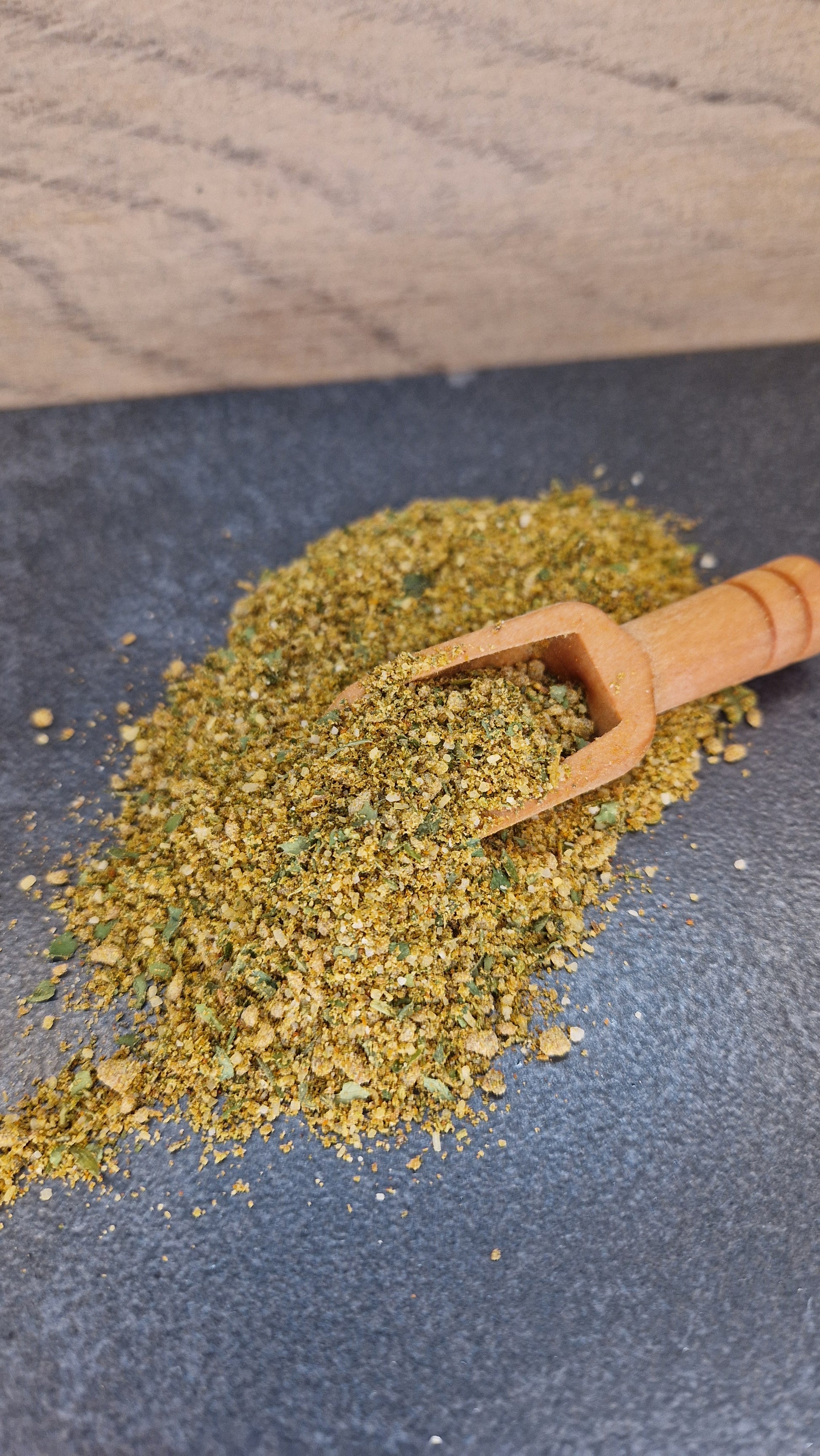 Meersalz, Röstzwiebel (Zwiebel, Palmöl,WEIZENmehl, Speisesalz), Knoblauch, Paprika edelsüß, Petersilie, Majoran, Oregano, Basilikum, Italienische Kräuter (Oregano, Basilikum, Rosmarin, Bohnenkraut, Thymian)